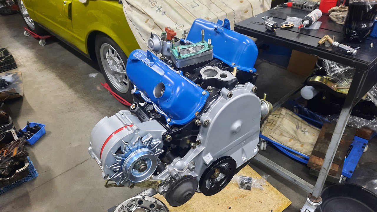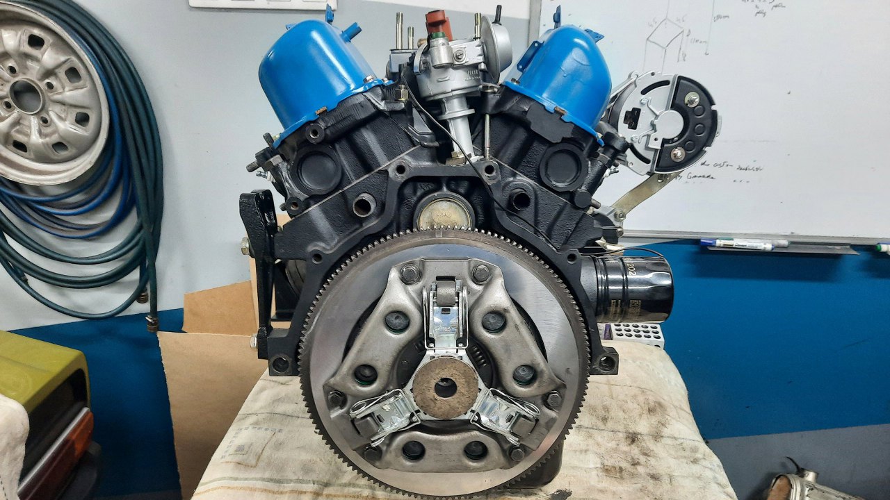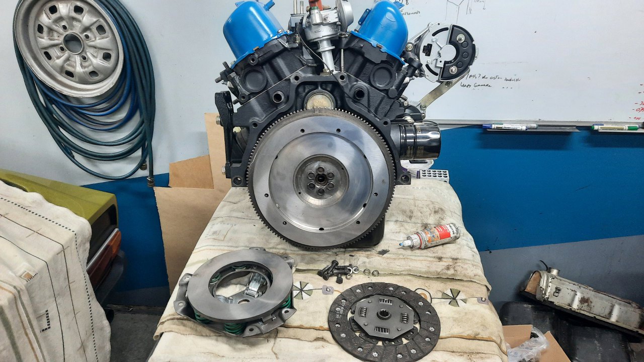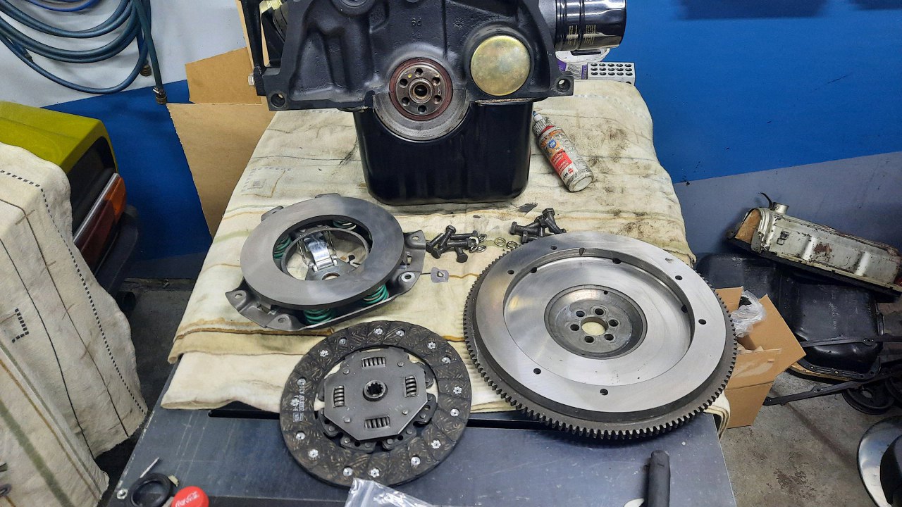Silnik jak widać zdjąłem już ze stojaka i wrzuciłem na stół warsztatowy. Wyciągnąłem już dawno gotowe koło zamachowe i sprzęgło. Koło i docisk były szlifowane, a tarcza sprzęgła ma nabitą nową okładzinę.