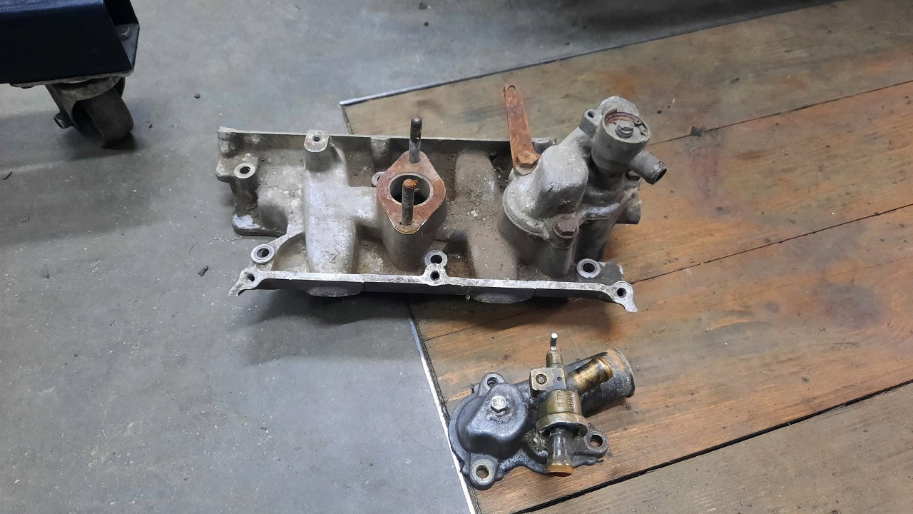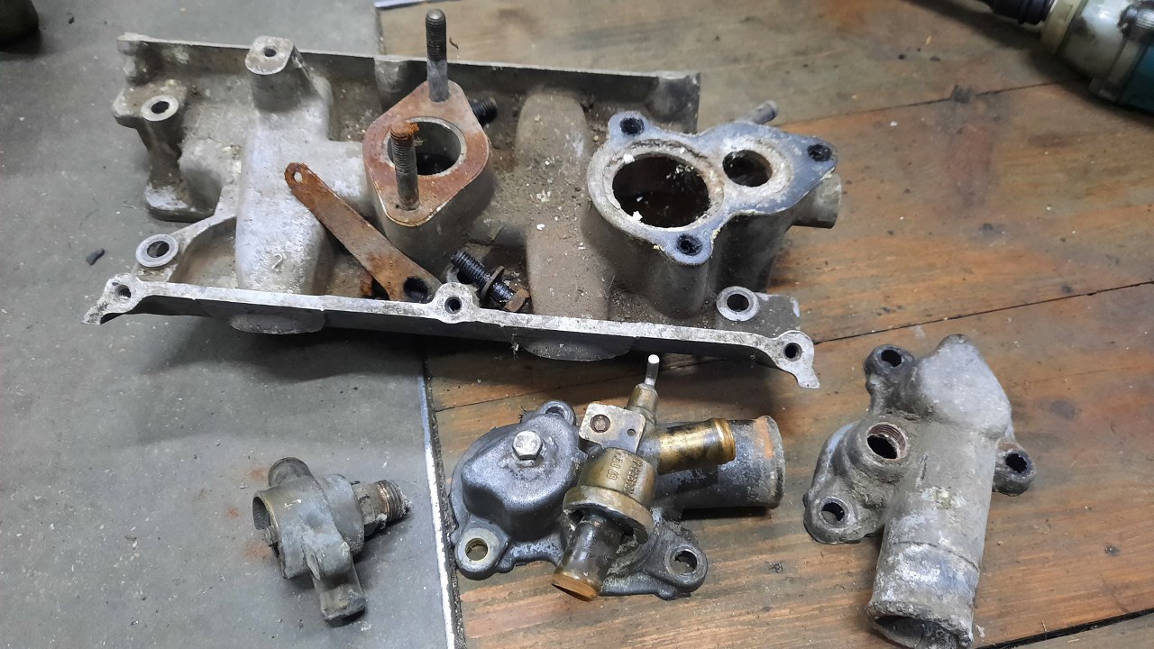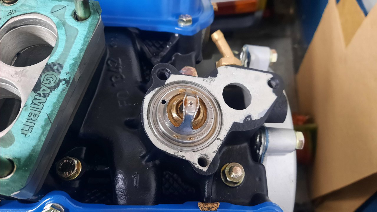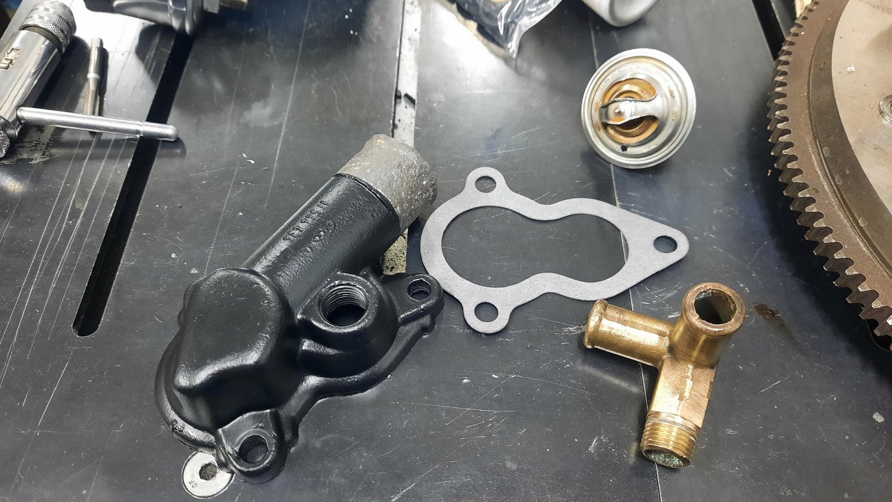 Brakuje mi jeszcze pokrywki termostatu. Ta, którą mam, ma wkręconą śrubę, prawdopodobnie, żeby pomóc sobie w odpowietrzaniu układu.Ma też zawór nagrzewnicy, który jest tu nieużywany. Dodatkowo ktoś go zalutował na głucho. Można to śmiało wywalić. W drugim kolektorze jest pokrywka bez wkręconej śruby, więc ona będzie użyta.