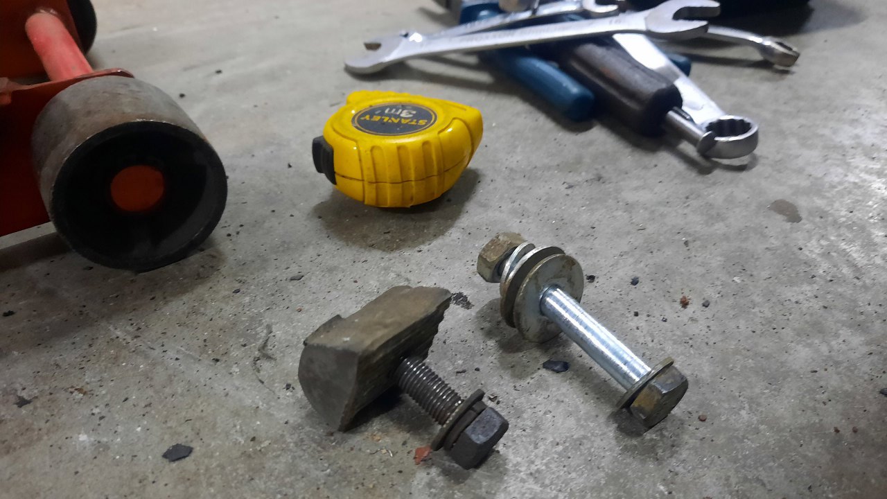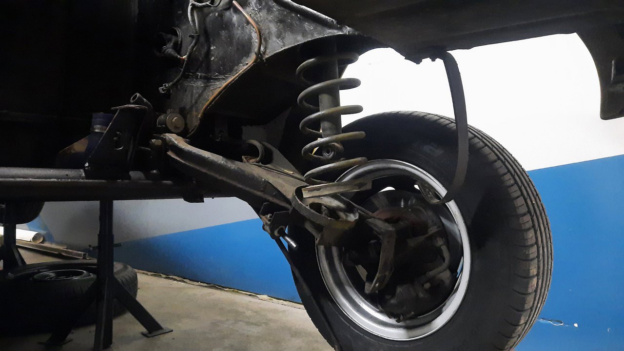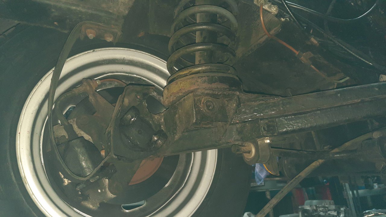 Po odkręceniu tych mocowań mogłem opuścić zawieszenie na ziemię i wyciągnąć je spod samochodu.