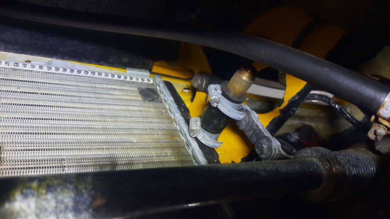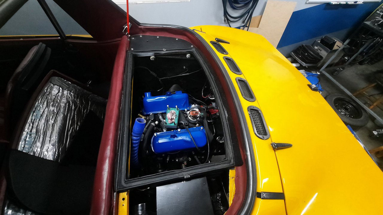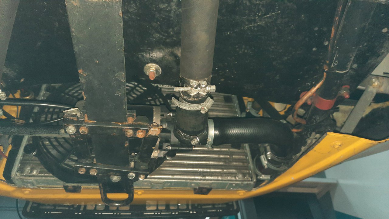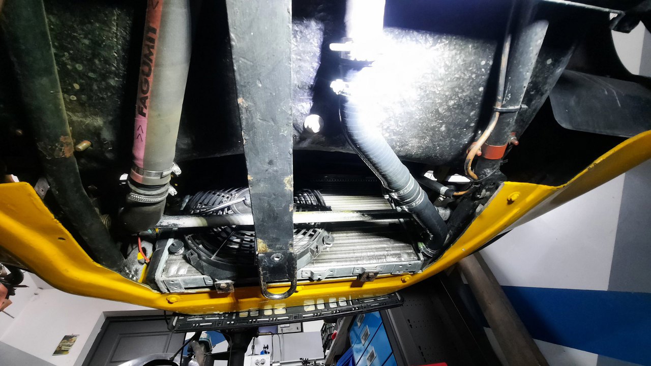Z przodu jest jakaś nieoryginalna chłodnica. I tak się silnik grzał, więc dołożona została elektryczna pompa wody. Grzanie się zdiagnozowałem jako za cienką dorobioną rurkę głównej magistrali wodnej w silniku. Potem jeszcze do tego doszły zabawy z gaźnikiem, bardzo, bardzo długotrwałe - z 5 razy go rozkładałem w drobny mak i składałem. Ostatecznie wylądował tam inny gaźnik, z innymi, większymi dyszami, co pomogło silnikowi wreszcie ładnie pracować... ale większe dysze oznaczają też, że silnik miał ubogą mieszankę, co też mogło prowadzić do grzania się silnika.