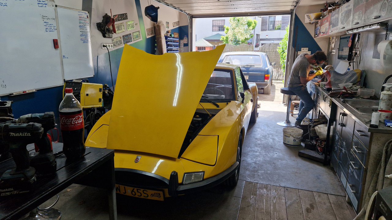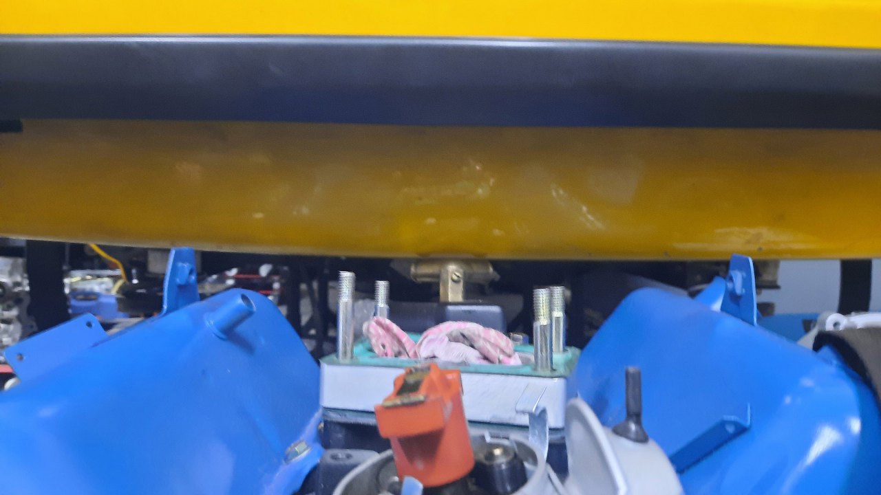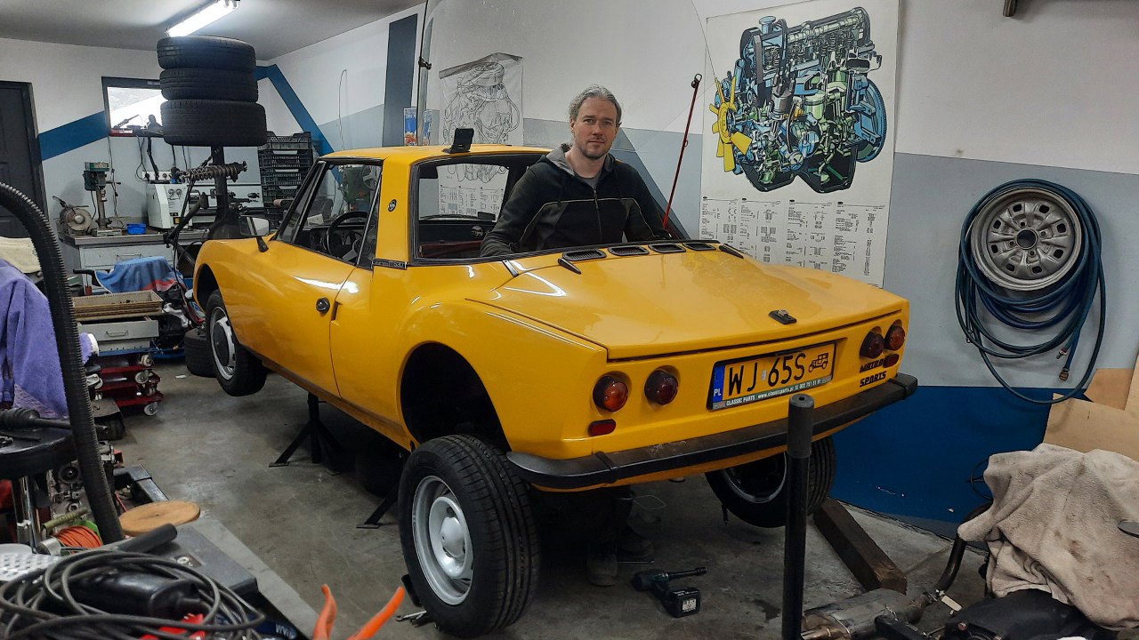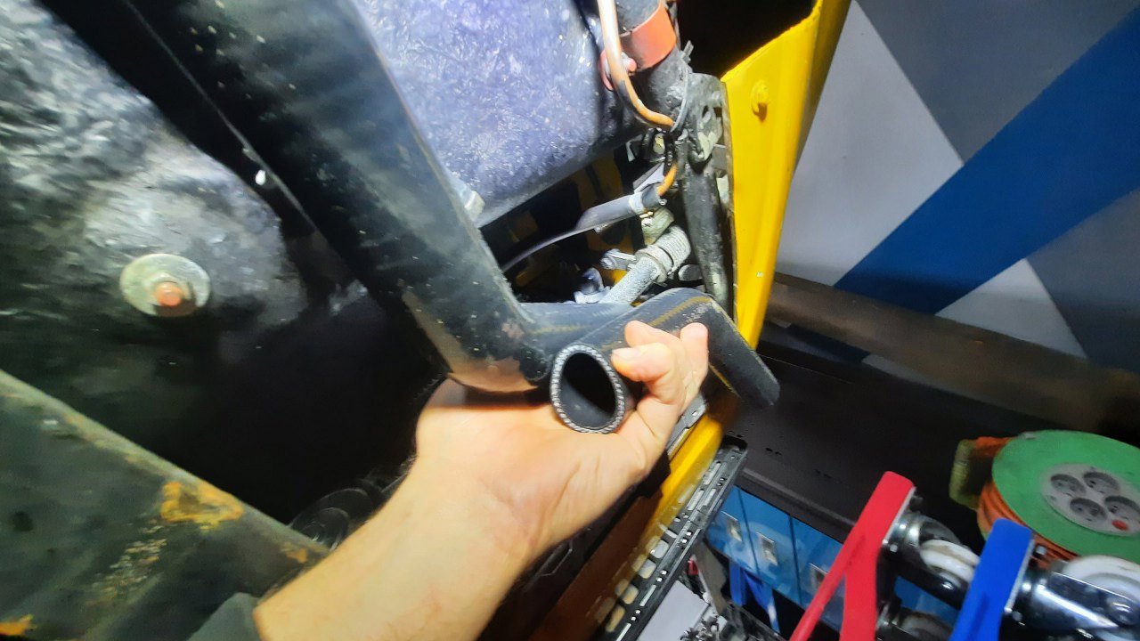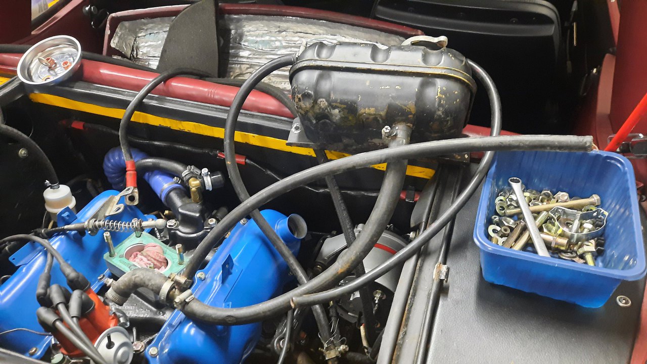 Z przodu jest jakaś nieoryginalna chłodnica. I tak się silnik grzał, więc dołożona została elektryczna pompa wody. Grzanie się zdiagnozowałem jako za cienką dorobioną rurkę głównej magistrali wodnej w silniku. Potem jeszcze do tego doszły zabawy z gaźnikiem, bardzo, bardzo długotrwałe - z 5 razy go rozkładałem w drobny mak i składałem. Ostatecznie wylądował tam inny gaźnik, z innymi, większymi dyszami, co pomogło silnikowi wreszcie ładnie pracować... ale większe dysze oznaczają też, że silnik miał ubogą mieszankę, co też mogło prowadzić do grzania się silnika.