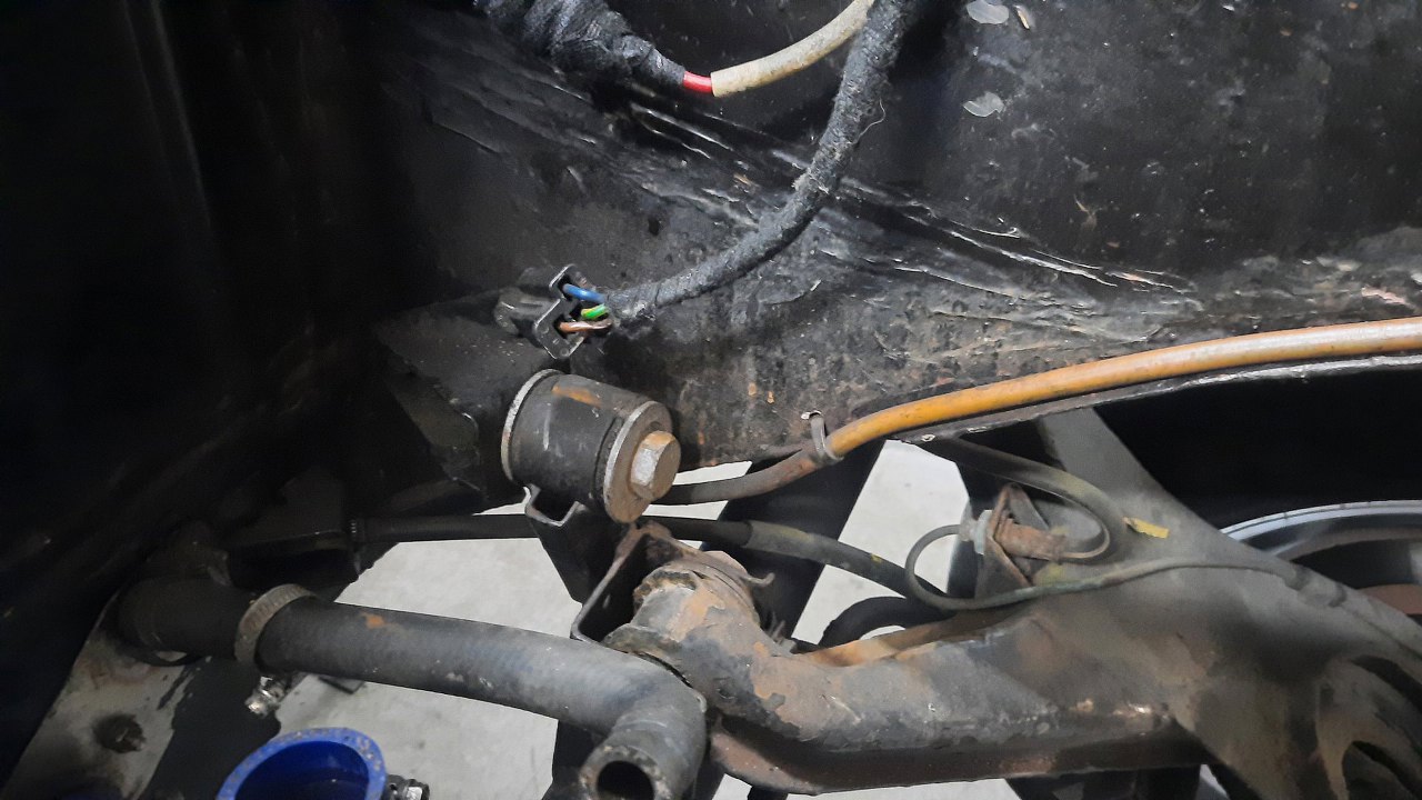 Belka zawieszenia przykręcona jest do karoserii przy podłużnicy, wewnątrz komory silnika. Co ciekawe, te mocowanie dokładnie miażdży miedzianą rurkę widoczną obok, odpowietrzającą chłodnicę do zbiorniczka wyrównawczego. Potem to przerobiłem, żeby było to drożne.