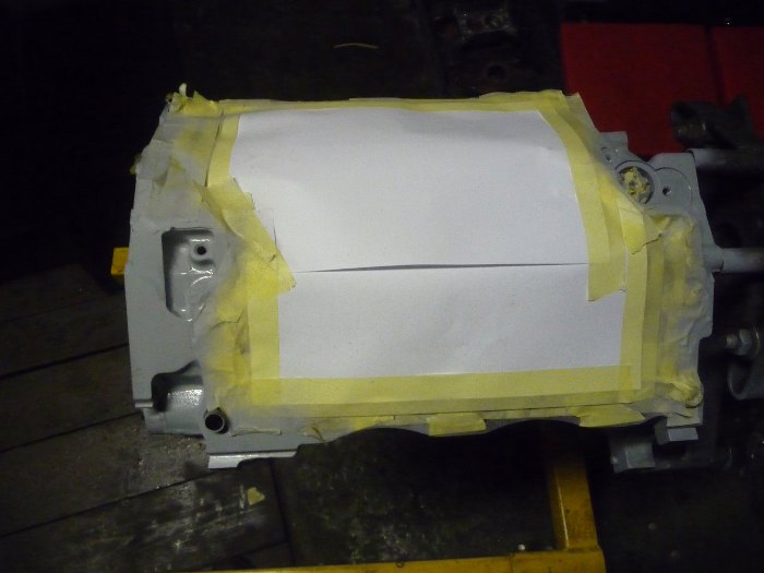 Blok pojechał na krótką wizytę w szlifierni. Został poddany honowaniu cylindrów (żeby nowe pierścienie miały sens) i planowaniu płaszczyzn pod głowice. Przy okazji w szlifierni go trochę domyli, więc odrobinę mniej pracy mnie czeka. Chociaż był tak usyfiony i w środku i na zewnątrz, że i tak mycie trwało wieki... Oprócz tego z zewnątrz blok został oczyszczony z resztek farby i rdzy. Potem, po odtłuszczeniu i oklejeniu - malowanie. Tu, na początek, podkład epoksydowy.