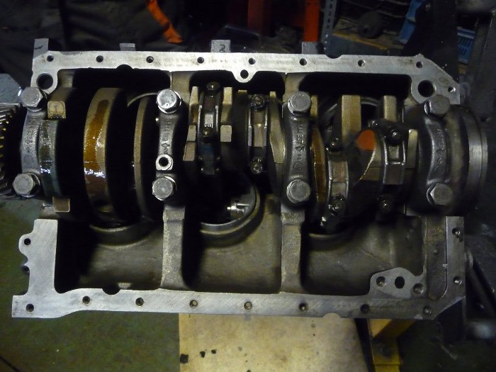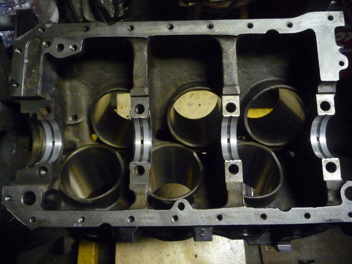 Po pomalowaniu bloku na czarno (kolor oryginalny) i wyschnięciu, przemyłem raz jeszcze dokładnie blok. Wybiłem też zaślepkę na końcu bloku zasłaniającą wałek rozrządu, bo tam zawsze sporo brudu zostaje. Następnie założyłem stare panewki główne, które podejrzewam na oko, że są jak najbardziej dobre, oraz przygotowałem umyty wcześniej wał korbowy.