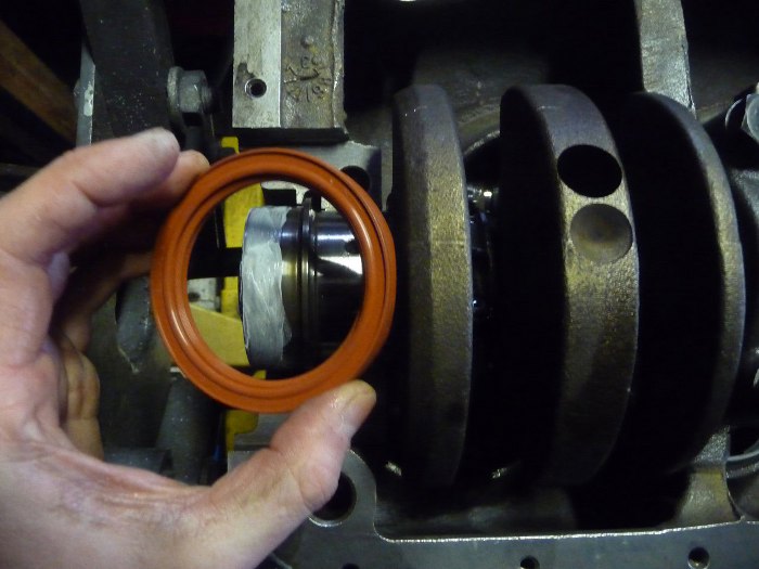 Kilka dni później odebrałem komplet uszczelek do tego silnika. Teraz mogę uzupełnić brakujący simmering w ostatniej podporze wału. Zdjąłem stopę wału, posmarowałem wał smarem montażowym i założyłem uszczelniacz.