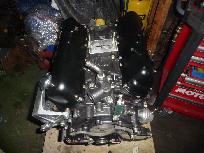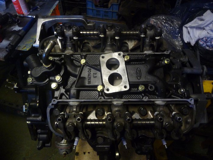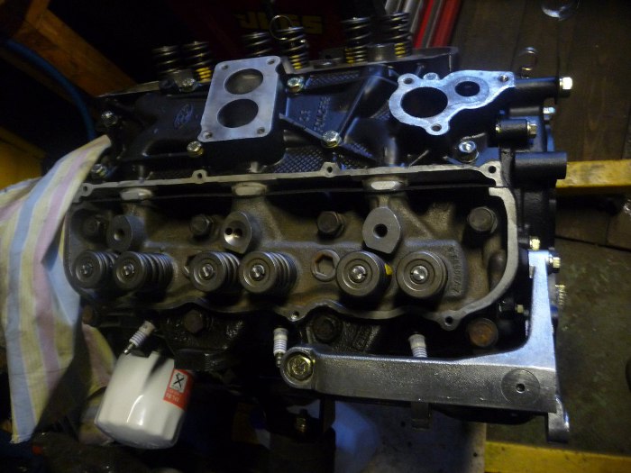Całość zamknąłem przykręcając pokrywy zaworów. Przykręciłem również kolanko z wyjściem płynu chłodzącego do chłodnicy i wkręciłem szpilki gaźnika w kolektor dolotowy.