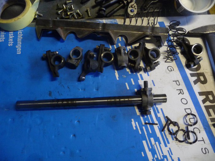 Potem założyłem gotowe ośki z dźwigienkami zaworowymi na silnik. To białe pomiędzy drążkami popychaczy a dźwigienkami to smar montażowy. W tym momencie ustawiłem od razu luzy zaworowe.