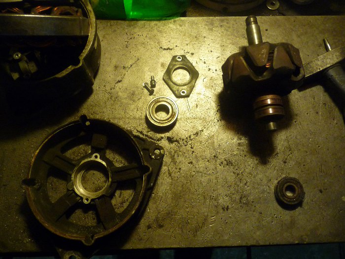 Łożyska wcisnąłem na wirnik i w obudowę, stojan oczyszczony i pomalowany, obudowa też gotowa. Tu warto pamiętać o tym, żeby nie zapomnieć włożyć tej falistej podkładki pod łożysko.
