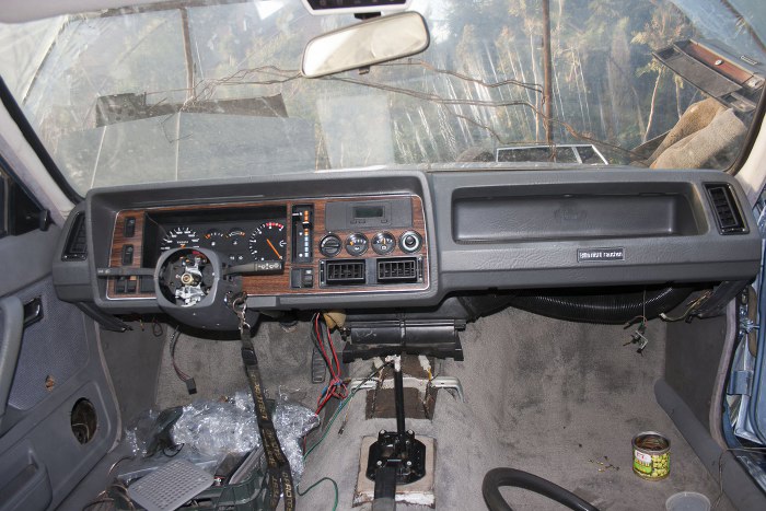 W międzyczasie poskładaliśmy nieco wnętrze. Już niewiele zostało, żeby je skończyć, ale najpierw trzeba znaleźć zgubiony pedał hamulca od automatu, bo bez niego nie założymy dolnej części deski rozdzielczej. Bez niej nie założymy podłokietnika i konsoli środkowej, a bez tego - foteli...