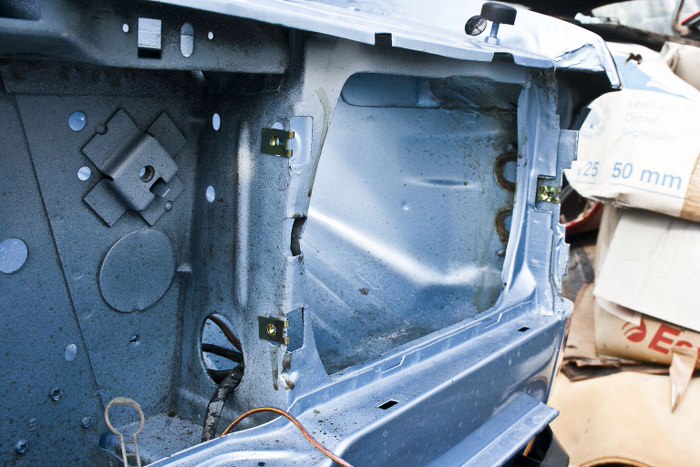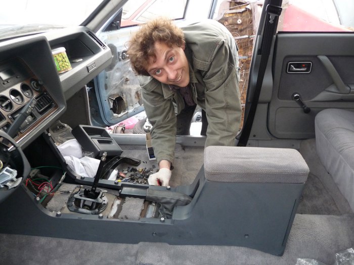 I prawie całkiem świeże zdjęcia, sprzed jakiś 3 tygodni, jak Michał wpadł mi trochę pomóc rozkręcać moją Granadę i w zamian ja pomogłem mu składać wnętrze. Włożyliśmy pedał hamulca z mocowaniem, całą dolną część deski rozdzielczej, i, jak widać na zdjęciu, podłokietnik.