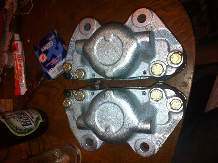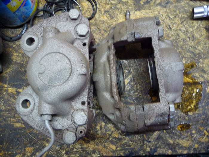 Potem zostały ocynkowane. Tłoczki hamulcowe wszystkie były zardzewiałe, z czego jeden do tego stopnia, że dopiero wywiercenie w nim otworu, nagwintowanie i wkręcenie śruby pozwoliło go wycisnąć z zacisku.