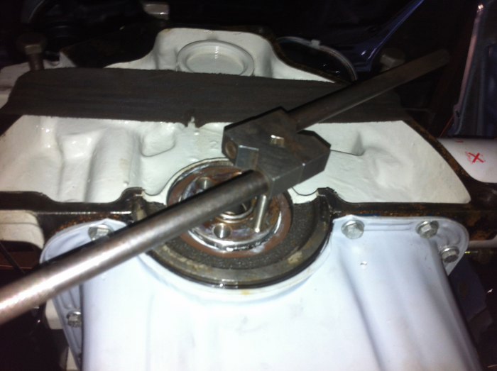 Potem założyliśmy skrzynię. Zdjęliśmy z niej miskę olejową, żeby sprawdzić co tam w środku na dnie miski się dzieje. Znaleźliśmy silikon w filtrze oleju (lubię to!).
