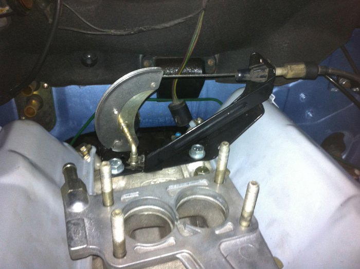 Mechanizm linki gazu przy gaźniku. Brakuje jeszcze mechanizmu mocowania linki kick-downu.