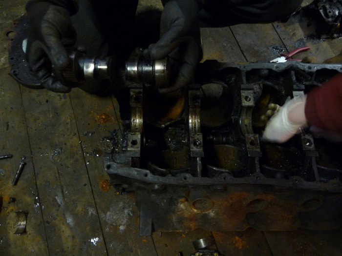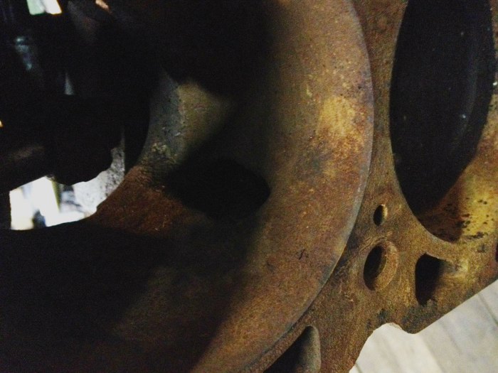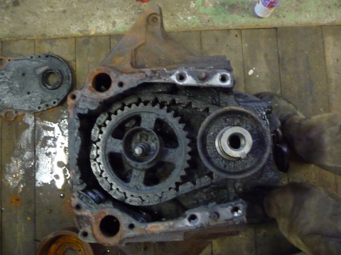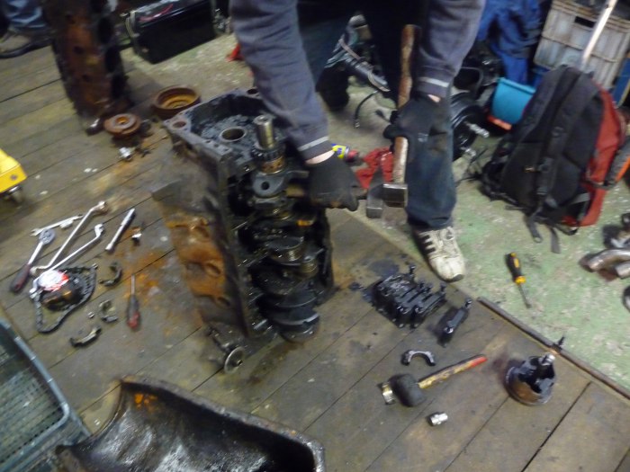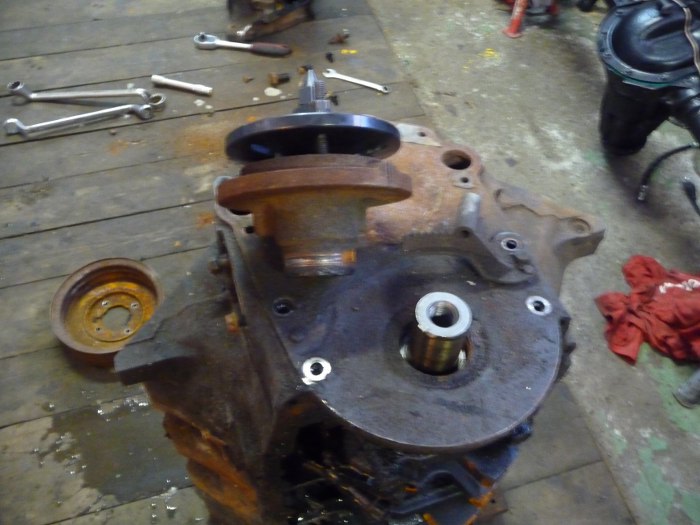 Zdjęliśmy koło pasowe i przeciwwagę wału (wał korbowy jest również zewnętrznie ważony, inaczej niż w większości silników. Koło zamachowe/flexplate i koło pod paskami mają spore przeciwwagi. Koło pasowe widać leżące po lewej stronie - ma wygląd i wielkość bębna hamulcowego od trabanta :)