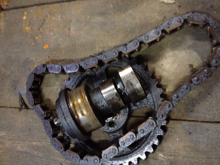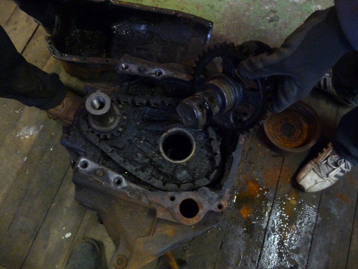 Pod pokrywą rozrządu widać dość luźny (uwaga, eufemizm) łańcuch. Przedwcześnie stwierdziliśmy, że nie jest źle, bo wałek rozrządu się obraca. Dla jaj postanowiliśmy, że spróbujemy zdjąć koło zębate i wałek bez wyjmowania łańcucha, żeby udowodnić, że da się go tak rozciągnąć.
