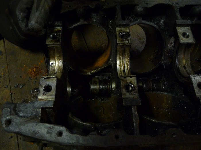 Miska olejowa ma ślady uderzeń korbowodu. Tego oczywiście nie za wiele widać, bo wszystko pokrywa szlam. Michał wydłubał z tego sporo fragmentów tłoka.