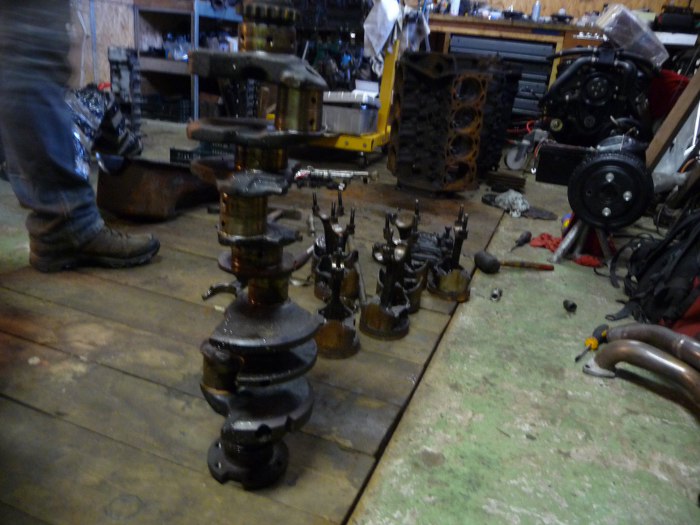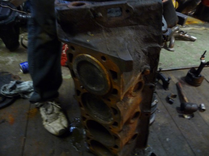 Potem Michał zawiózł to wszystko do szlifierni, gdzie się okazało, że dwa cylindry można tulejować (oczywiście, standardowo w takich przypadkach dziur w cylindrach, bez gwarancji, że będzie dobrze) a reszta da się szlifować na nadwymiar +0.030. No to mamy kolejny silnik do zrobienia. Trzeba też znaleźć skrzynię, która to wytrzyma, bo TH200, którą mam jest za słaba.
