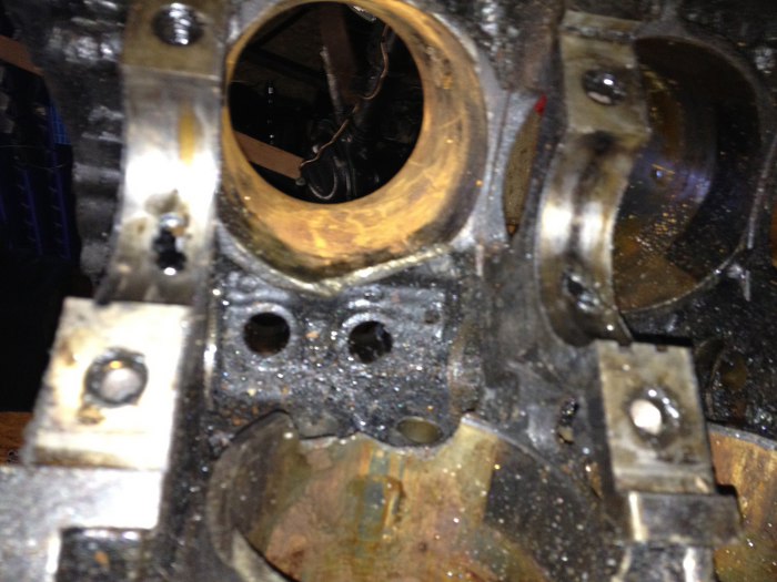 Kiepsko widać, ale poglądowo wstawiam to zdjęcie - ta ciemna plama na czymś, co było gładzią cylindra to dziura wybita przez korbowód.