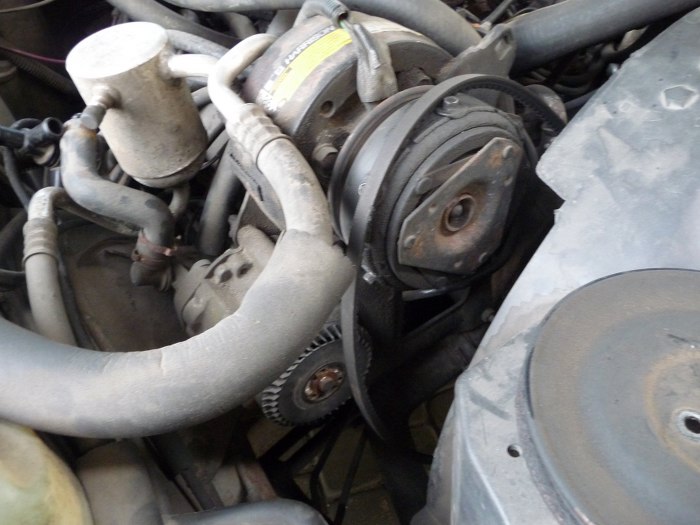 Poniżej kompresora klimatyzacji widać pompę powietrza, już bez koła pasowego. Zdjęcie jej wymaga wymiany paska klinowego, potrzebny jest krótszy, żeby napędzić sprężarkę klimy.