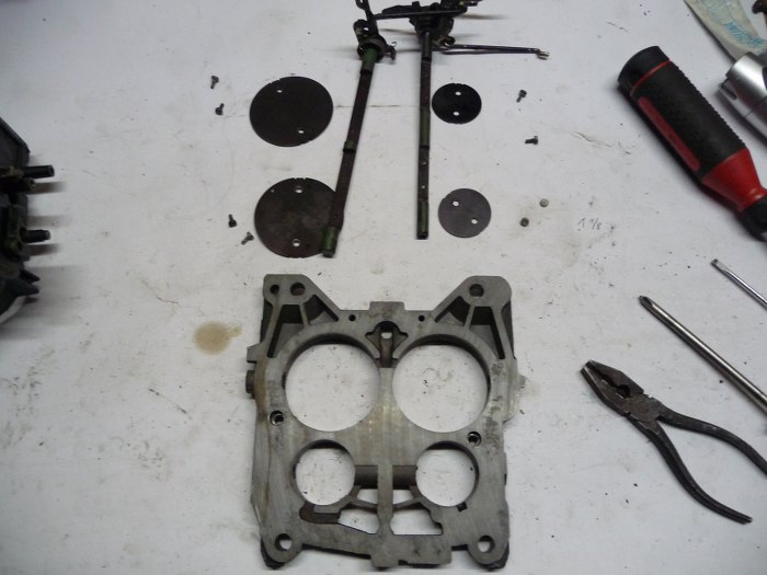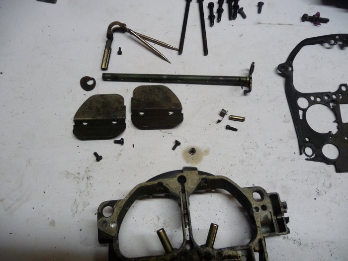 Po zdjęciu pokrywy był lepszy dostęp do wyjęcia osi klapek ssania drugich gardzieli. Wyjąłem też coś czego nie znam polskiej nazwy :) - metering rods.