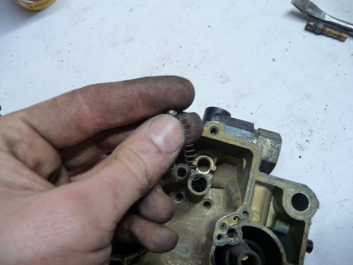Potem wziąłem się za opróżnianie korpusu gaźnika. Pompka przyśpieszacza, pływak, zaworek iglicowy...