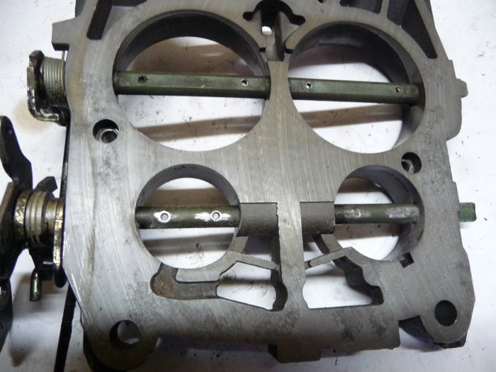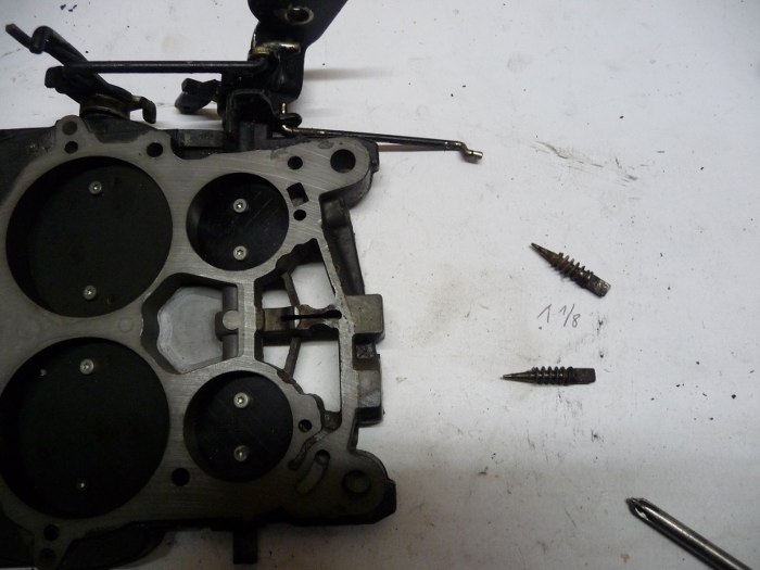 Odkręciłem również przepustnice. Standardowo śrubki były zakute, ale większość mi się udało odkręcić. Urwałem tylko dwie. Po wyjęciu przepustnic oszlifowałem ośki dremelem, żeby nie porysować wnętrza podstawy gaźnika podczas ich wyjmowania.