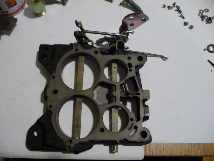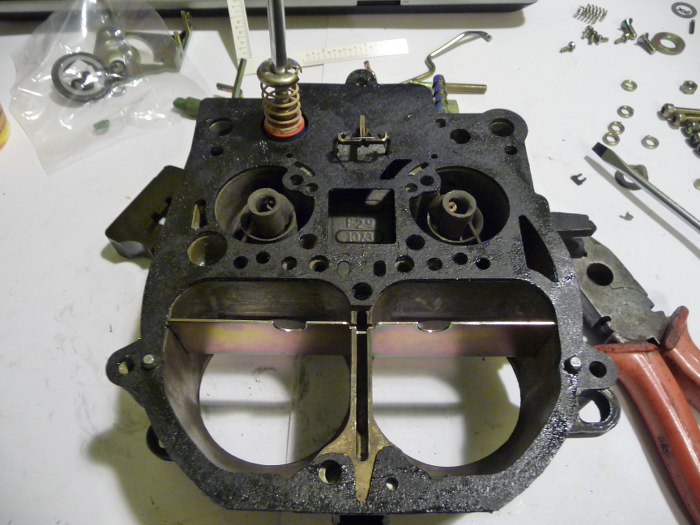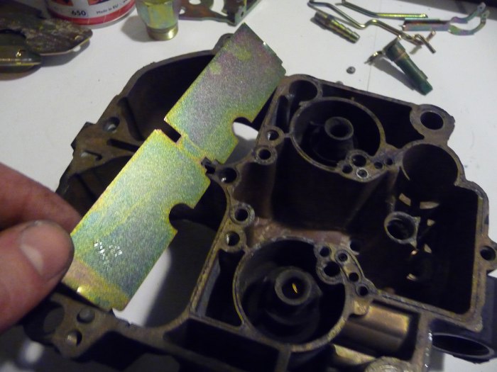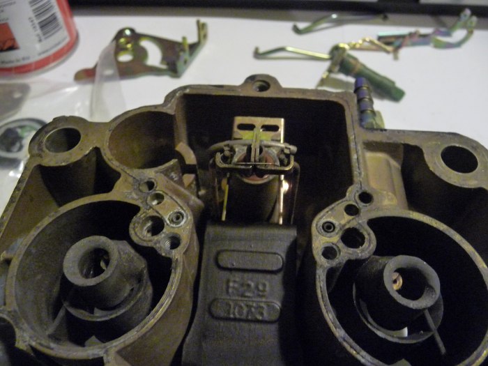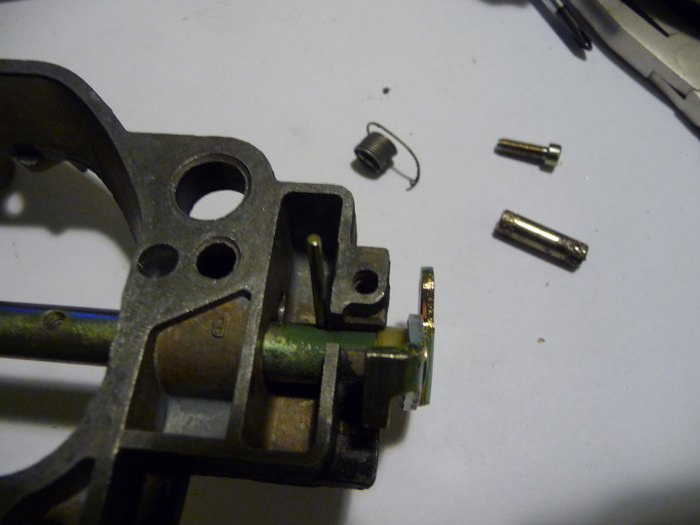 Następnie je wyjąłem, bo się okazało, że w tym samym momencie w korpus gaźnika należy włożyć kilka elementów. Tu widać te cięgno z założonym popychaczem (czy jak to nazwać, to te płaskie pośrodku). Po prawej stelaż mechanizmów klapek ssania i ośka (ją akurat kiepsko tu widać).