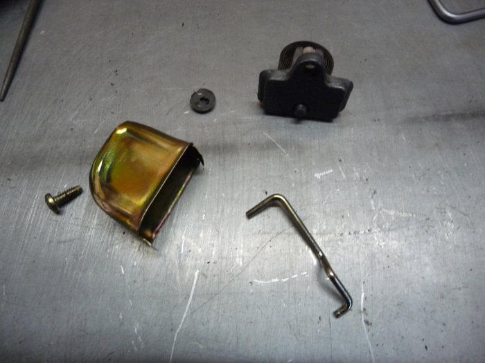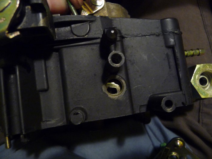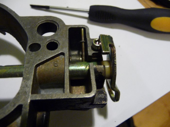 Tu widać gdzie trafia ten płaski element z poprzedniego zdjęcia. W tym momencie pokrywa gaźnika jest już założona na korpus. W otwór w korpusie wchodzi ośka i napędza cięgno.