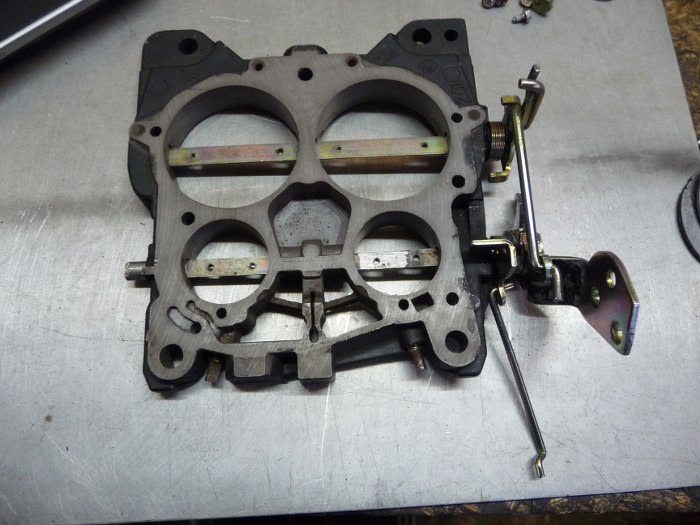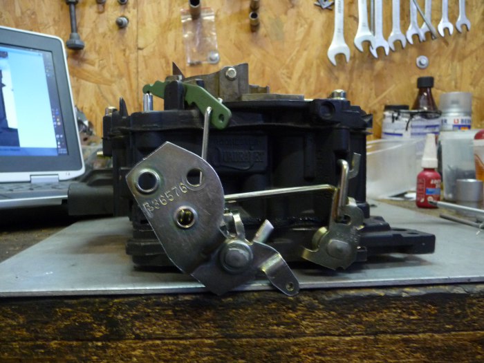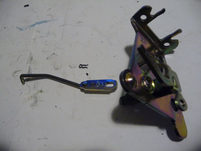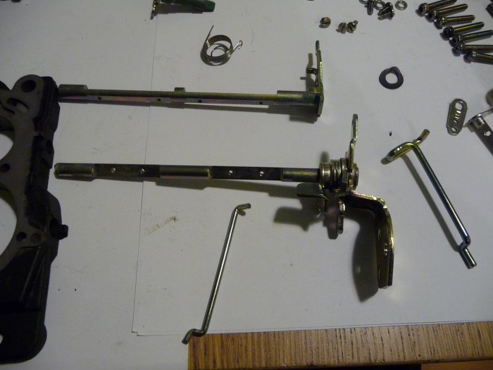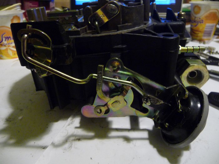 Tak wygląda mechanizm cięgien z boku. Przed przykręceniem podstawy gaźnika do korpusu tzreba założyć cięgno pompki przyśpieszacza.