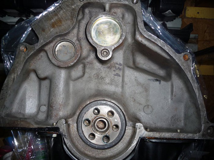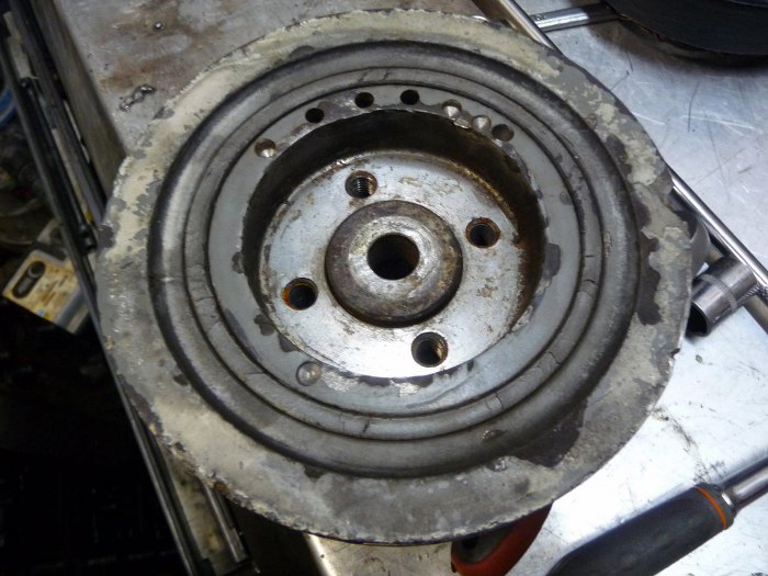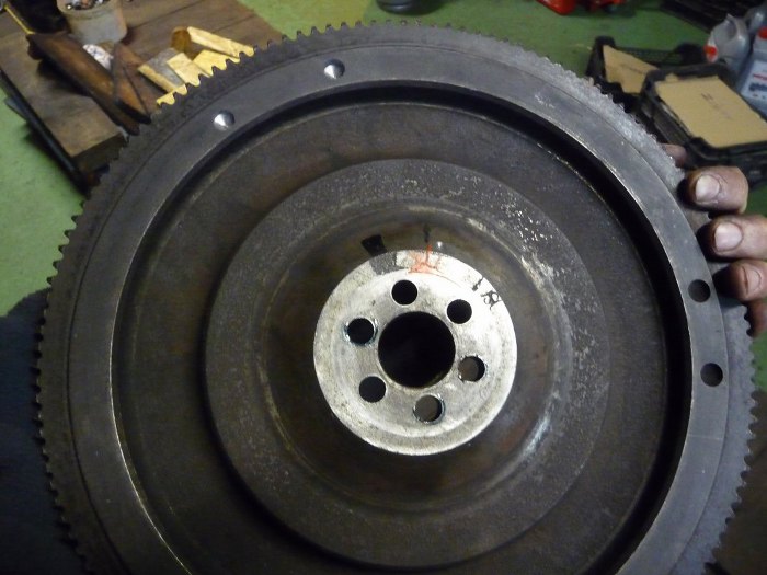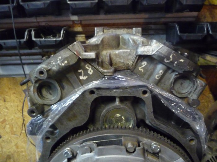 Potem zdjąłem silnik ze stojaka, żeby zwolnić miejsce następnemu. Wtedy tez mogłem się dostać do tyłu silnika i wbić zaślepkę wałka rozrządu. Zwróć uwagę na nabity punkt na wale korbowym. Jest to znak z wyważania, informujący o wzajemnym położeniu wału i koła zamachowego.