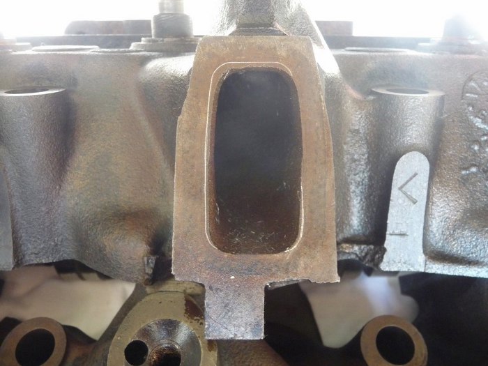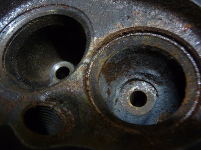 Na tym etapie zająłem się głowicami. W sumie silnik pochłonął 4 komplety głowic... Część okazała się pęknięta, część pękła podczas nabicia twardych gniazd zaworowych... Co ciekawe żadnej głowicy nie straciłem podczas obróbki realizującej moją wydumkę :) Ale o tym później. Tu widać pęknięcie między gniazdami zaworowymi.