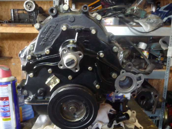 Po pomalowaniiu kółka pasowego, głowic i pompy wody przykręciłem co nieco. Znowu musiałem szukać śrub, bo przecież nic przy tym silniku nie miałem. Po tym zdjęciu założyłem jeszcze termostat i jego obudowę.