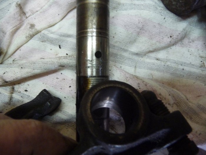 Niestety z chyba 16 takich kompletów większość miała podobną przypadłość i zostały mi tylko 4. Bierze się to stąd, że olej na górę silnika idzie z głównej magistrali olejowej na panewki główne wału korbowego i jednocześnie na panewki wałka rozrządu. Panewkami drugą i trzecią wałka przedostaje się do kanałów zasilających głowice, a stamtąd podporami środkowymi tych koników przechodzi do rurki widocznej na zdjęciu i smaruje dźwigienki. Problem jest taki, że panewki wałka rozrządu się zużywają i powodują słabsze docieranie oleju na górę silnika. Dźwigienki zaczynają pracować prawie na sucho i trą o ośkę. No i powstają rysy jak na zdjęciu...