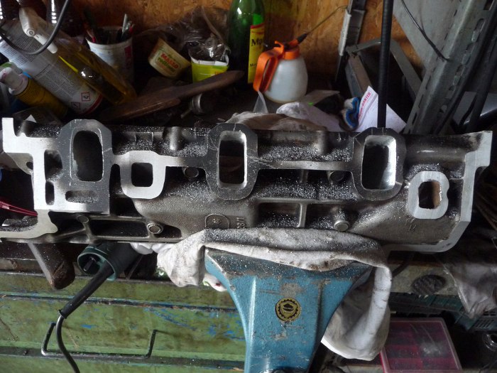 I wstępnie frezowane. Tak jak głowice szły lekko, bo frez ładnie wybierał żeliwo, tak aluminium zaczęło zapychać frez i nic się nie dawało zrobić. Dopiero po zakończeniu frezowania podłapałem trick, żeby się alu nie czepiało freza, muszę to sprawdzić w praktyce. Całe frezowanie tego kolektora natomiast robiłem Dremelem przy jakiś 6-7 tysiącach obrotów, bo szybsze powodowały zapychanie freza.