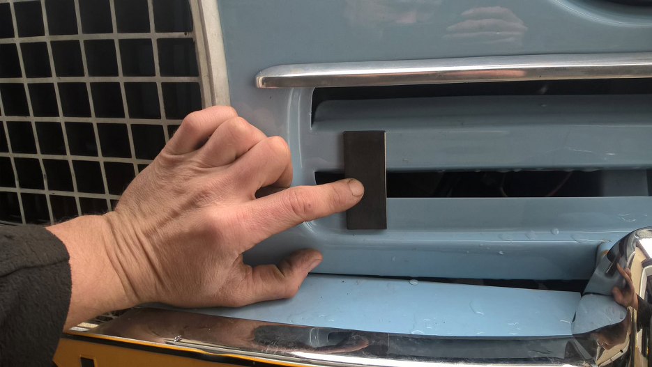 Kolejna przymiarka. Naprawdę trzeba mieć jaja, żeby zacząć wiercić w takim ładnym samochodzie. Ja nie mam.