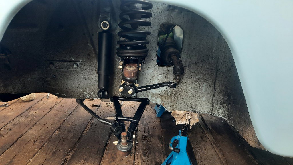 Założone nowe wahacze górne, razem ze sprężyną i ramieniem zwrotnicy. Na miejscu są też już wahacze dolne i amortyzator.