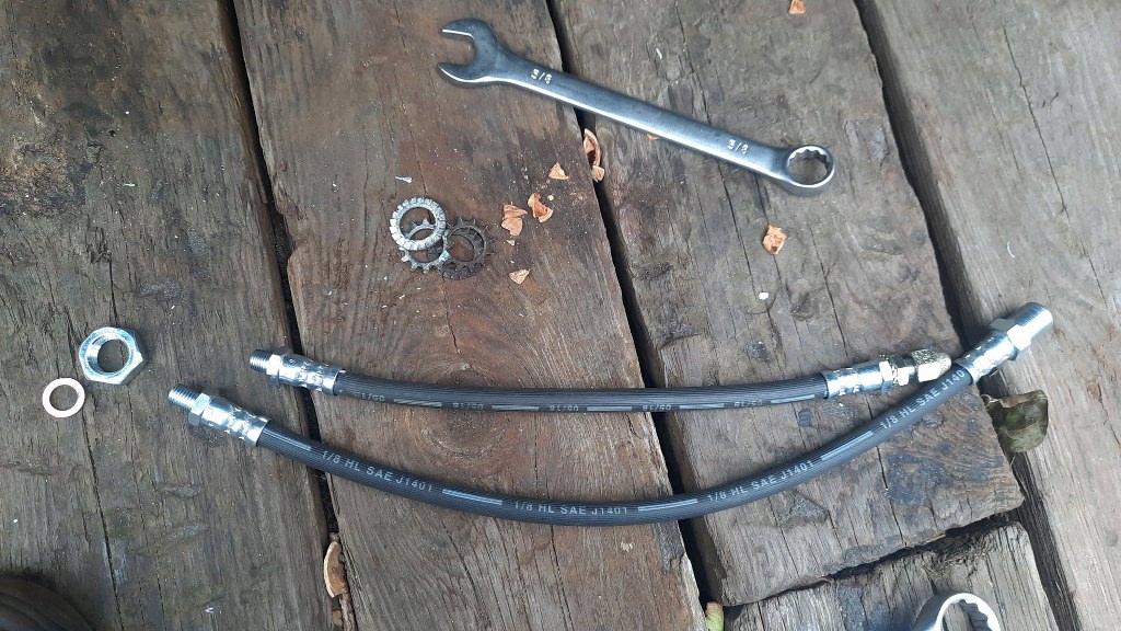 Prawie. Nowe rurki hamulcowe przelatują na wylot przez otwory w karoserii. To te po prawej. Po lewej te, które były założone - mają dużo większą średnicę gwintu trzymającego je w karoserii.