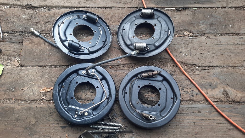 Bębny i szczęki są zamienne, ale cylinderki i tarcze kotwiczne nie. Po prawej są części z tego Saaba z 1962r., a po lewej z tego nowszego, z 1963r. Wyczyściłem wszystko to, co było, cylinderki są suche i sprawne, więc użyję je ponownie.