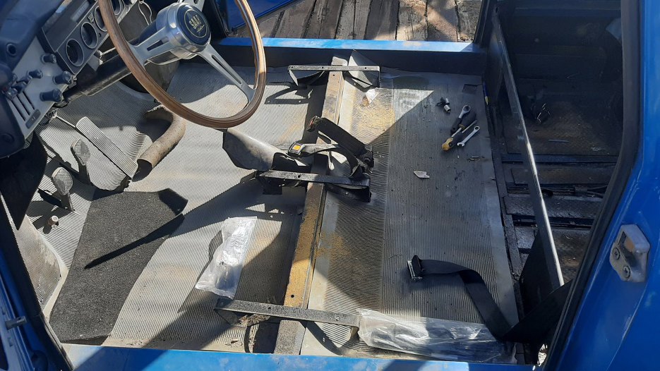 Widok na podłogę. Wykładzina gumowa na moje oko jest oryginalna, ale niestety bardzo krucha. Nie wiem, czy przetrwa montaż.