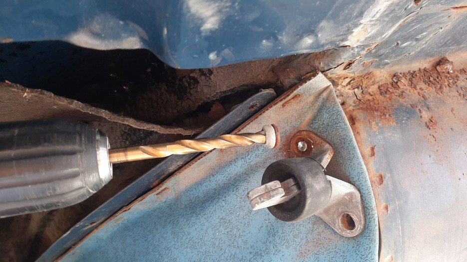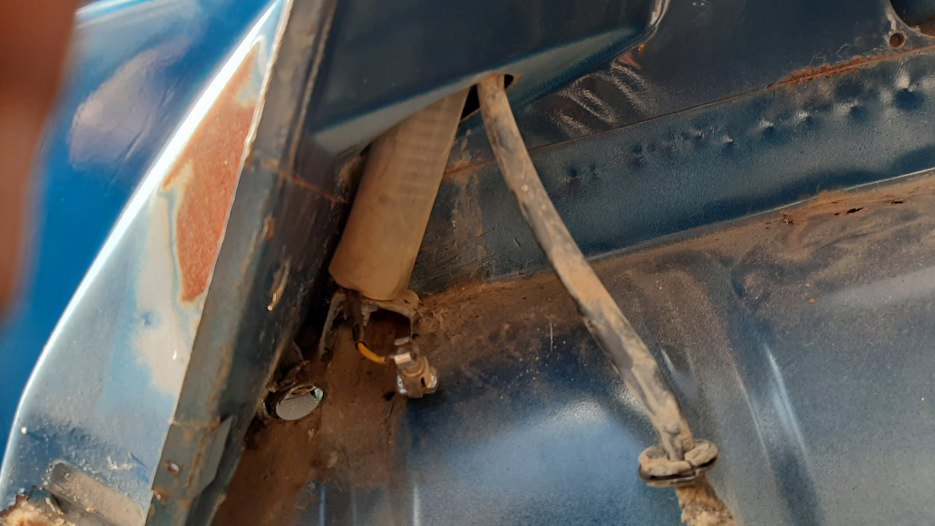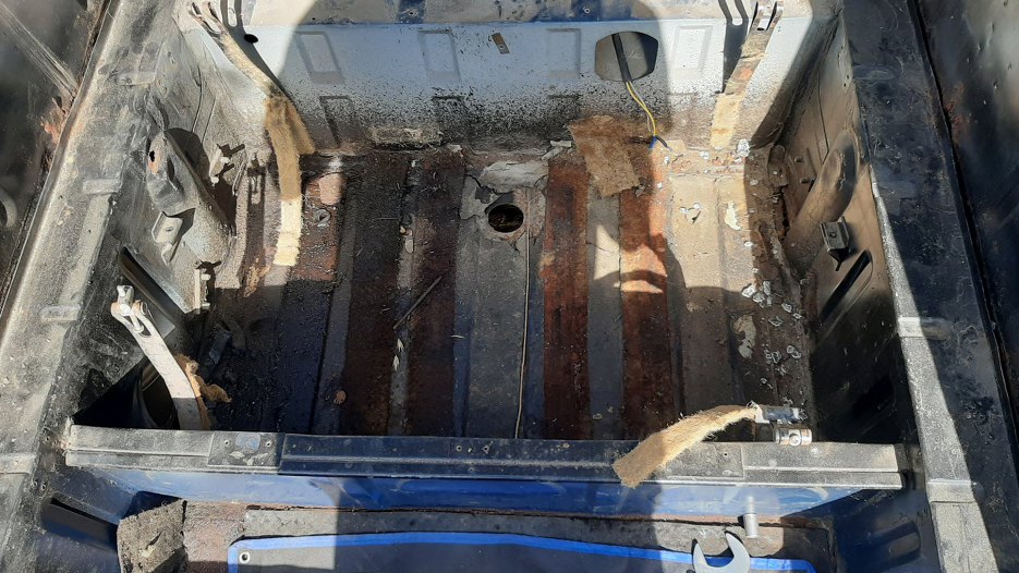 Szyny foteli są przykręcone do blach przy podłodze poprzez drewniany klin. Co ciekawe jeden z nich jest nieco nadpalony. Możliwe, że to przy poprzedniej naprawie blacharskiej, bo odkryłem później kilka łatek w podłodze.