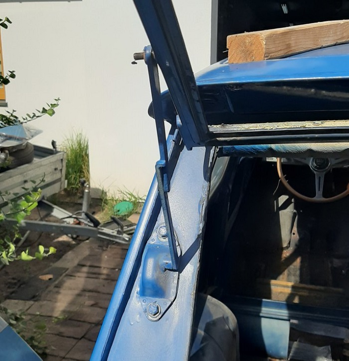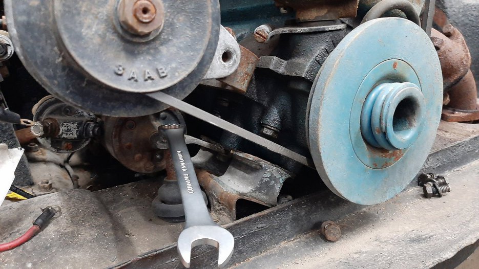 Po odkręceniu tego paska parcianego (ogranicznika otwarcia) wystarczy ją unieść z dwóch punktów mocujących z przodu i jest zdjęta. Mam teraz widok na wszystkie 850 cm3 pojemności Saaba. Nazwijcie mnie laikiem, ale dopiero po przeczytaniu tabliczki znamionowej dotarło do mnie skąd się wzięła nazwa SAAB :).