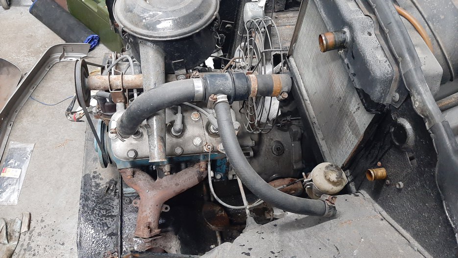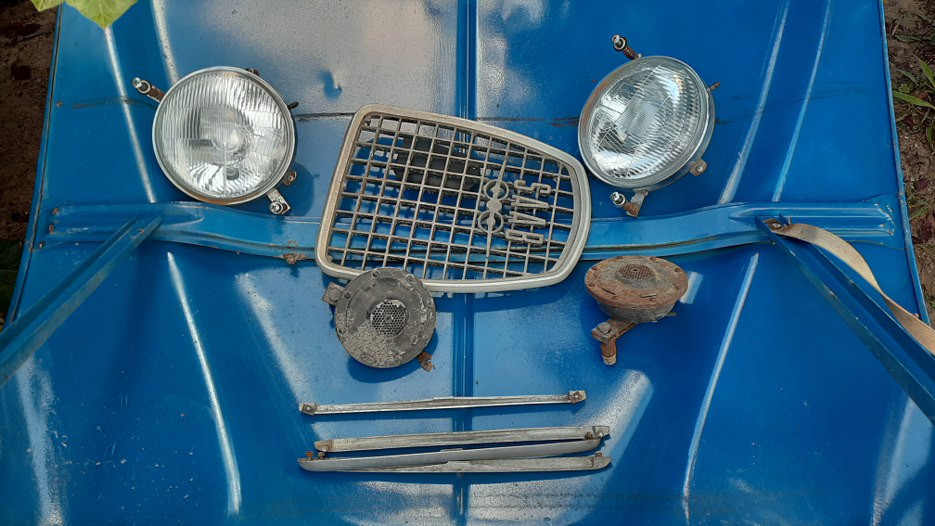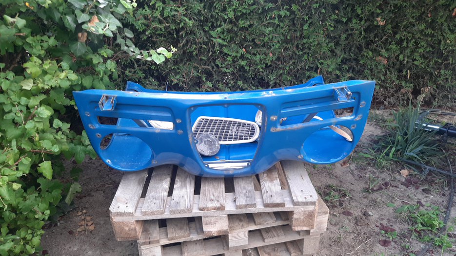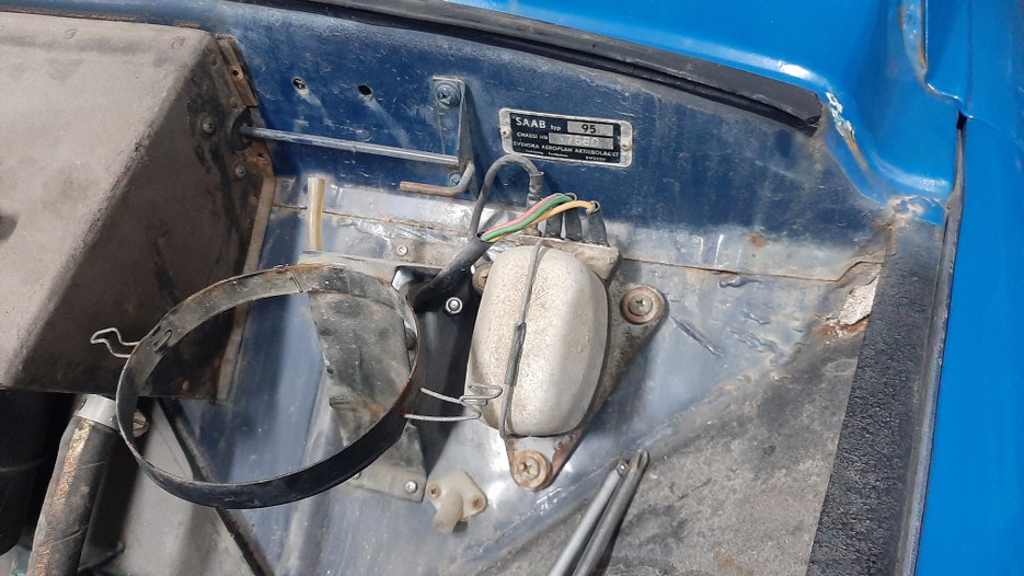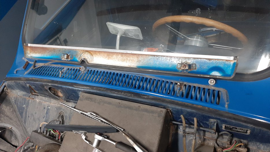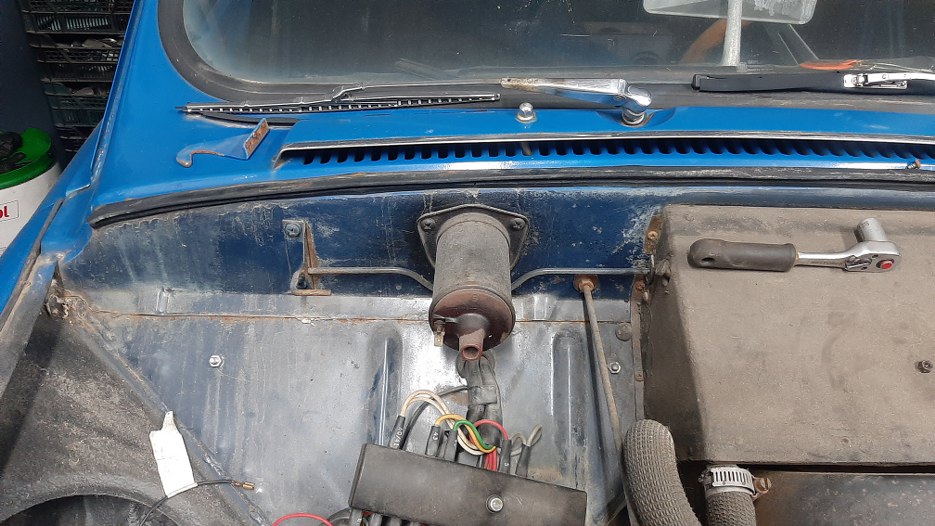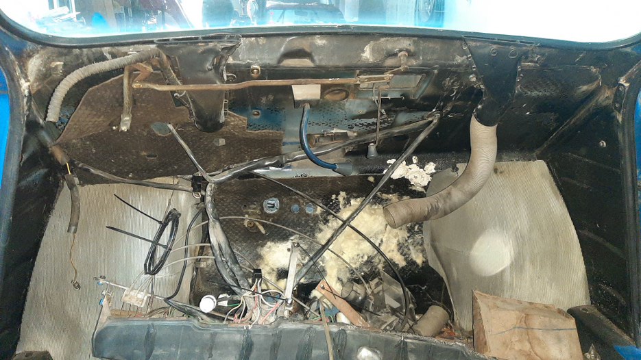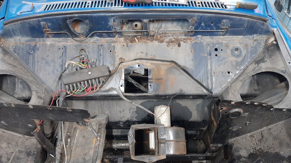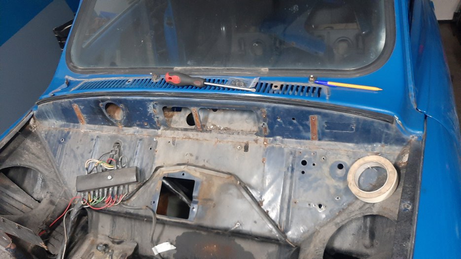 Od strony komory silnika zdemontowałem dmuchawę nawiewu i nagrzewnicę z obudową. Pręt w poprzek to zamknięcie maski. A tak w ogóle, to ten ciemniejszy granatowy kolor to jest oryginalny kolor tego auta.