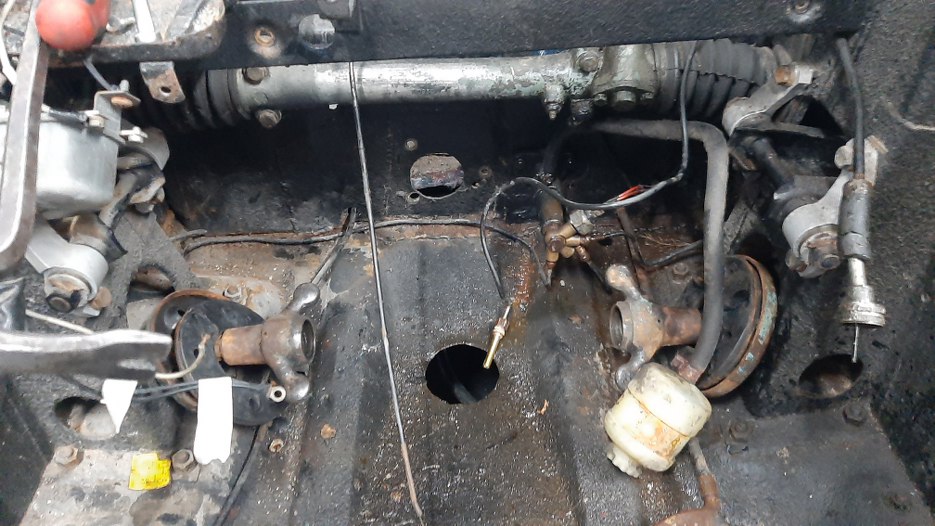 Co zastałem pod silnikiem. Rurki hamulcowe bez sentymentu wyciąłem, bo były przekorodowane.