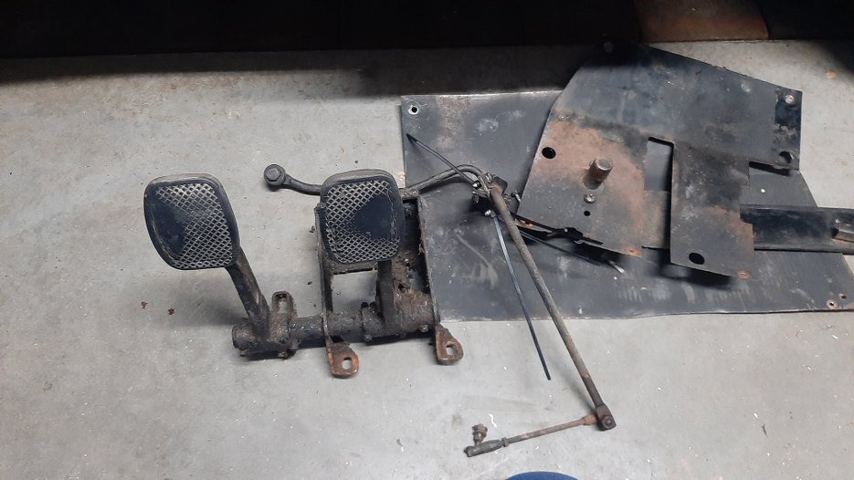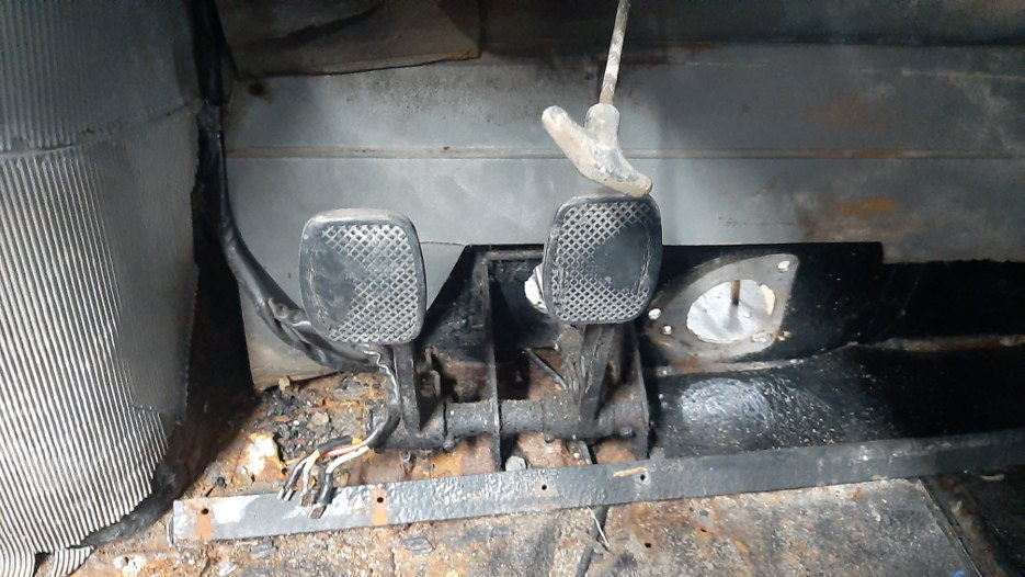 Od strony kabiny pedały są osłonięte blachą. Tu już ktoś był, bo przykręcona jest na samowierty. Zresztą jest też nieźle wyżarta rdzą po lewej stronie od sprzęgła.