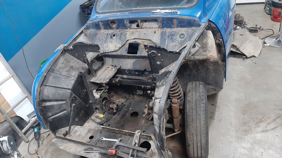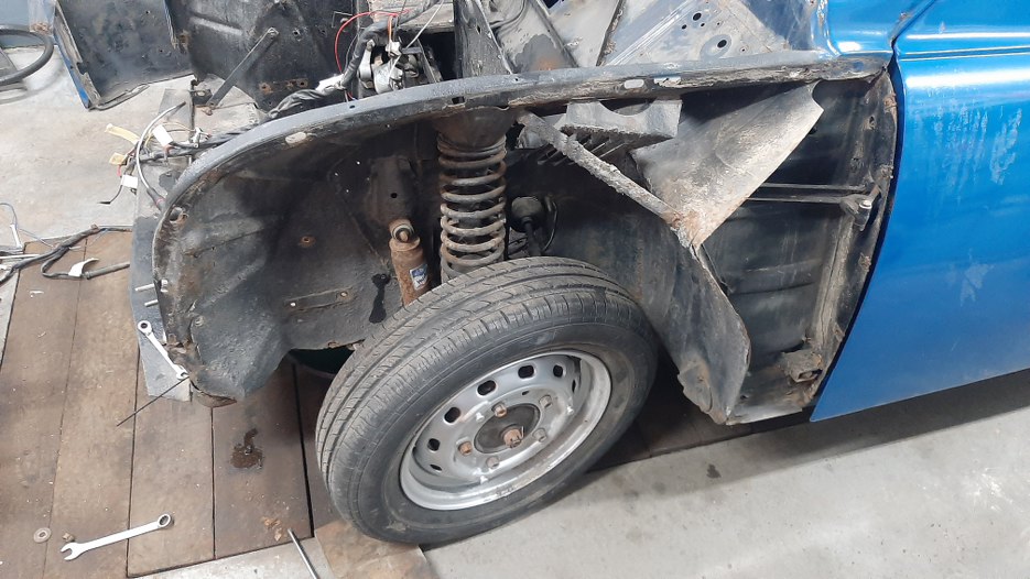 Dla relaksu zdjąłem jeden błotnik. Drugiego nie daję rady odkręcić, bo samochód stoi za blisko ściany i nie mogę na tyle szeroko drzwi odkręcić, żeby sięgnąć do ostatniej, najbardziej upartej śruby.