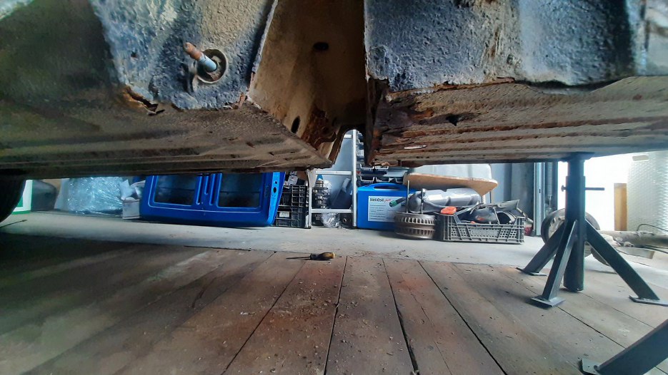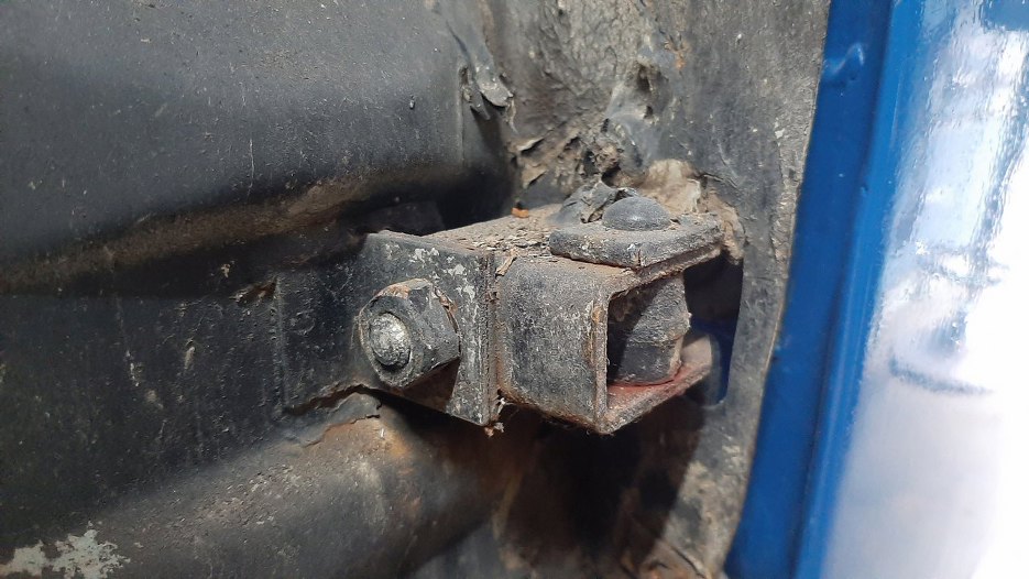 Środkowe mocowanie ledwo, bo ledwo, ale widać. Są to dwa kątowniki przykręcone do nadwozia, zaraz je zresztą też odkręciłem. Niezbyt ledwo, a właściwie całkiem wyrażnie (może nawet aż za bardzo) widać korozję...