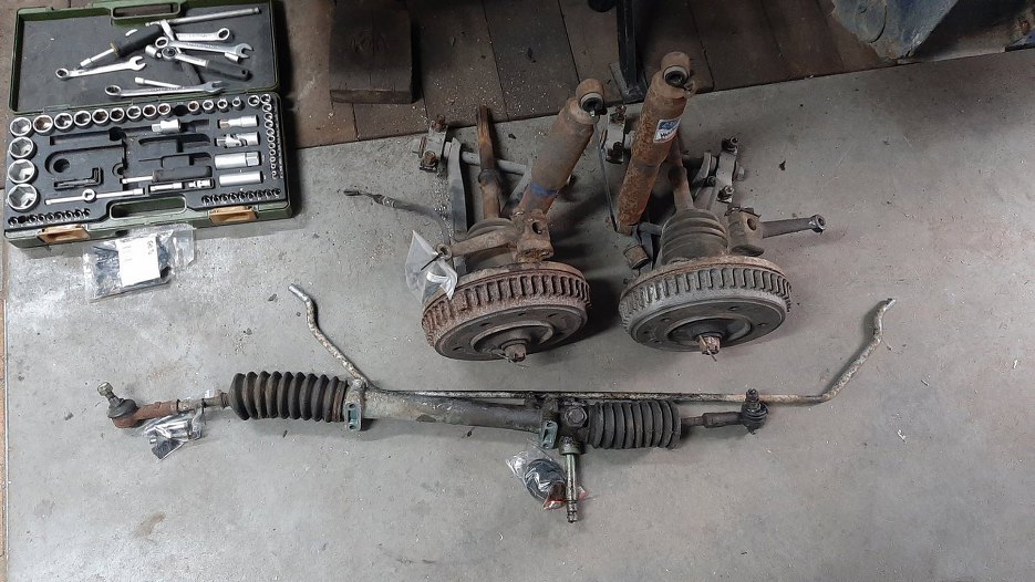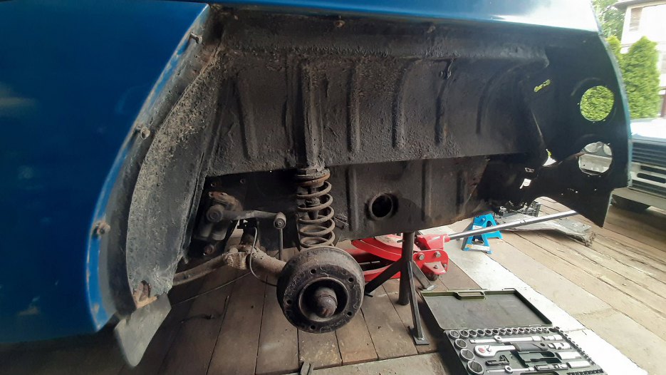 Wahacze odkręciłem z łatwością, ale śruba mocująca zawieszenie do karoserii dokładnie pośrodku auta wykazała się podziwu godnym oporem. Walczyła do ostatniego zwoju i przysporzyła mi zakwasów w mięśniach w nieoczekiwanych miejscach. Musiałem ją odkręcać pchając ją nogą, leżąc na plecach, trzymając się rękami słupka drzwi, żeby mieć się za co zaprzeć. Ubaw po pachy.