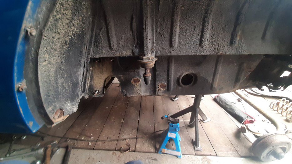 Tu widać dokładniej gdzie jest wkręcona. Ale nawet wiedząc, że ona tu jest, nie udało mi się jej odkręcić. Musiałem Tą wspawaną w karoserię nakrętkę urwać kluczem i dopiero wtedy puściła. A nakrętkę da się przyspawać z powrotem...