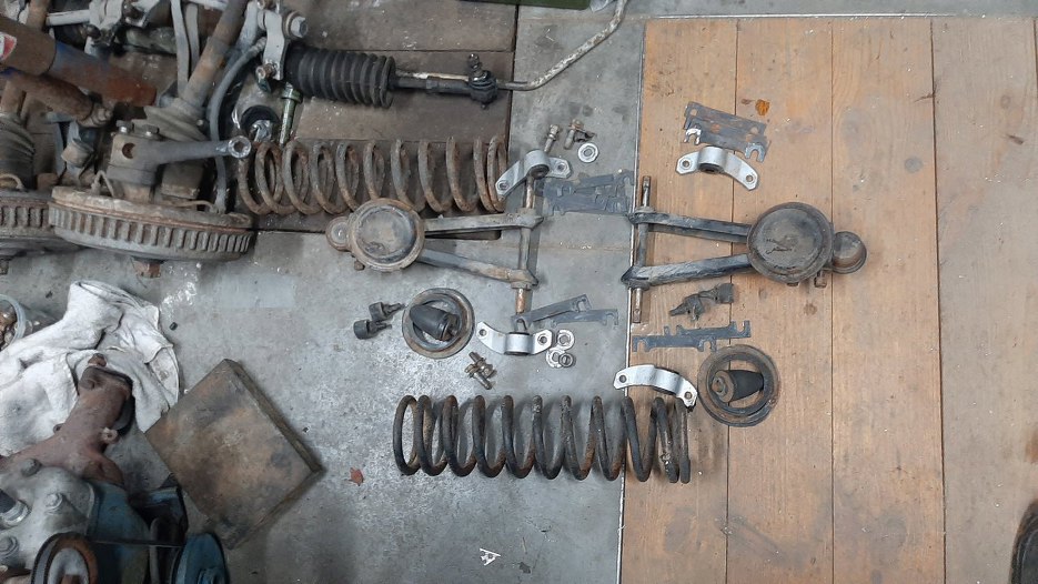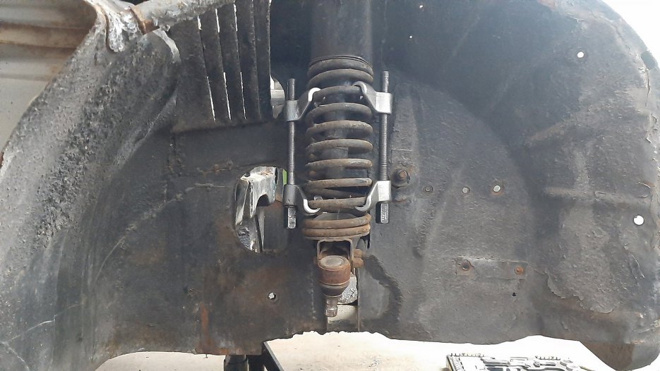 Zdjąłem ograniczniki zawieszenia, amortyzatory ramieniowe i sprężyny. Odboju nie jestem w stanie odkręcić... (jeszcze!)