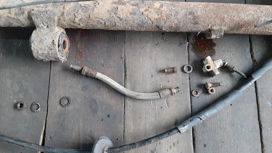 Potem rozkręciłem rurki hamulcowe i odciąłem końcówki. Rurki i tak trzeba dać nowe, bo te są pordzewiałe i krzywe.